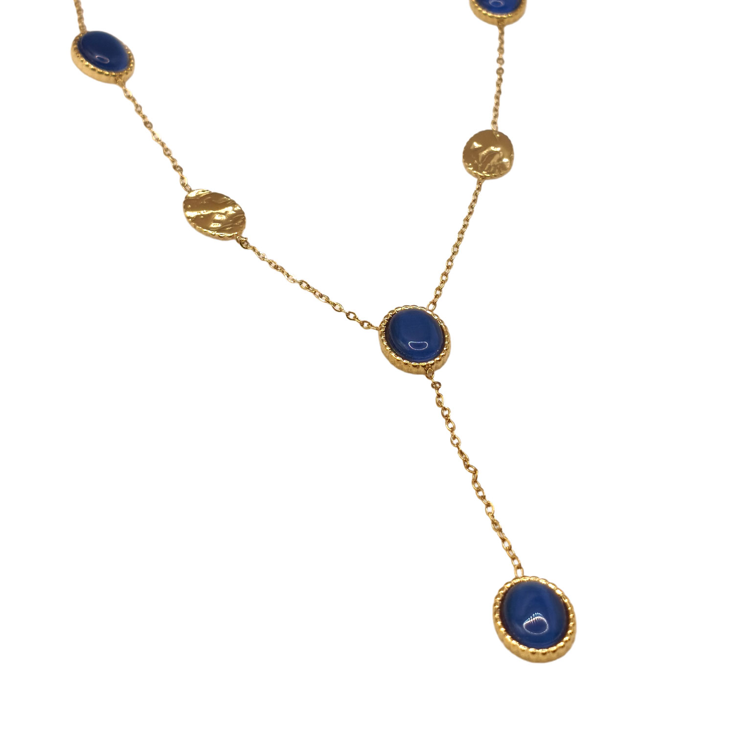 - Διακόσμηση: Μπλε οβάλ πέτρες σε χρυσό περίγραμμα & σφυρήλατοι χρυσοί δίσκοι