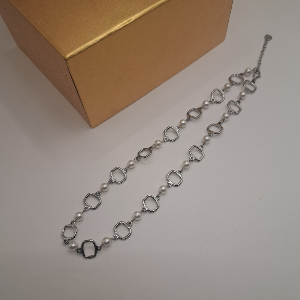 - Αυτό το κομψό ασημί κολιέ συνδυάζει διακριτικά μεταλλικά στοιχεία με λαμπερές πέρλες, δημιουργώντας έναν μοναδικό συνδυασμό κλασικής κομψότητας και μοντέρνου στυλ.