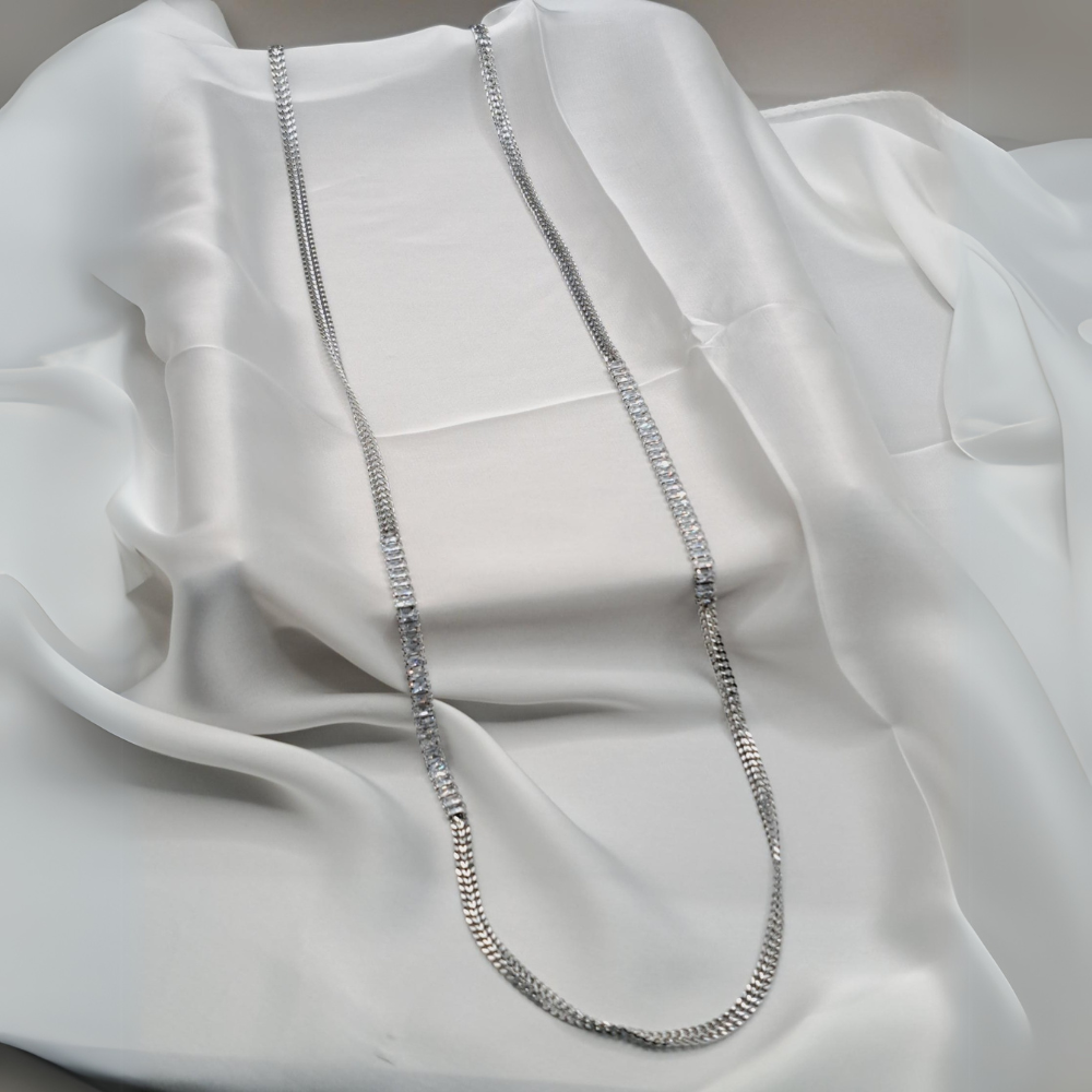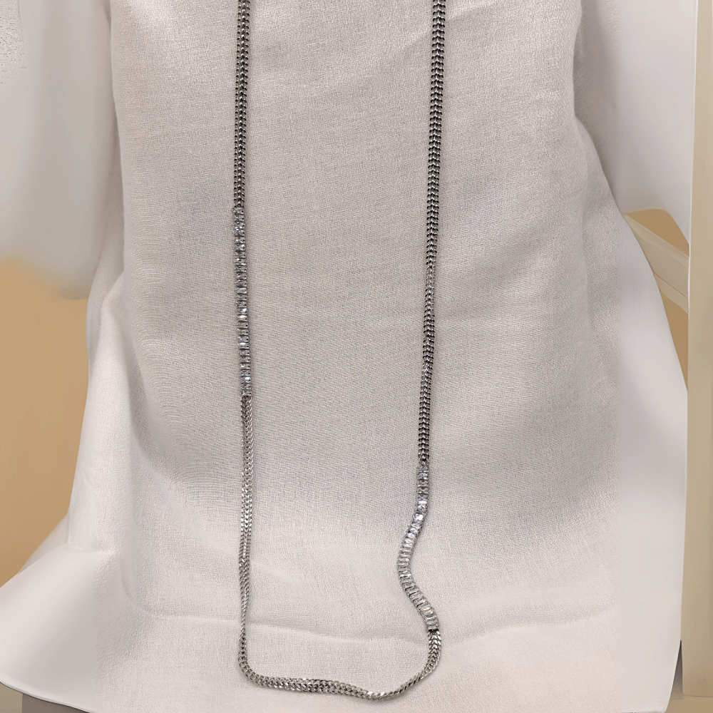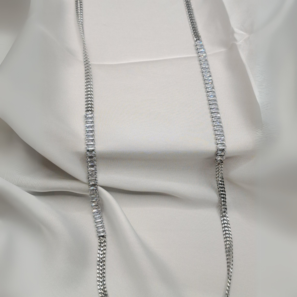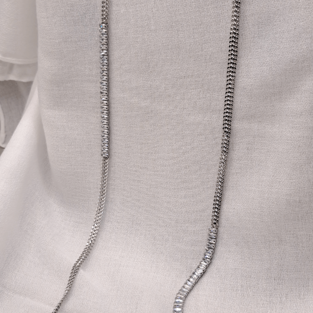• Αυτό το κομψό μακρύ κολιέ διαθέτει έναν διαχρονικό σχεδιασμό από ασημένια αλυσίδα με λεπτομέρειες από λαμπερά, ορθογώνια κρύσταλλα που προσδίδουν πολυτέλεια και κομψότητα.