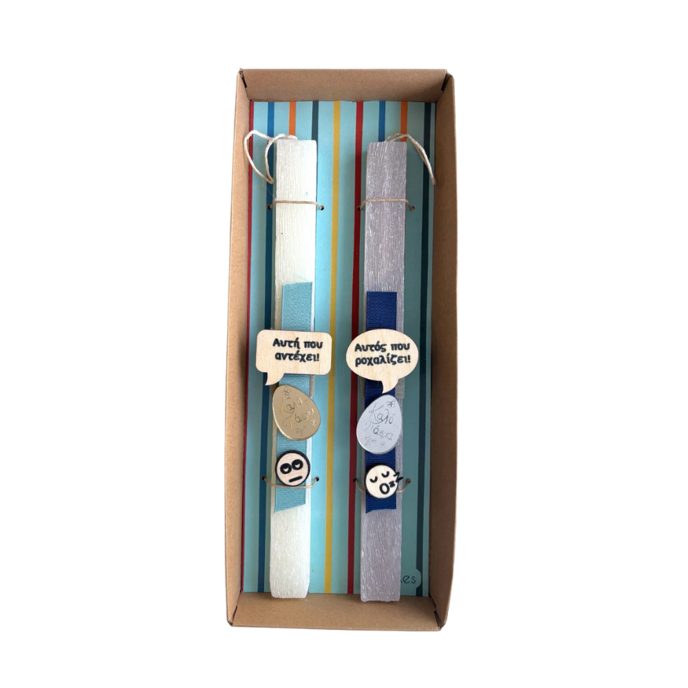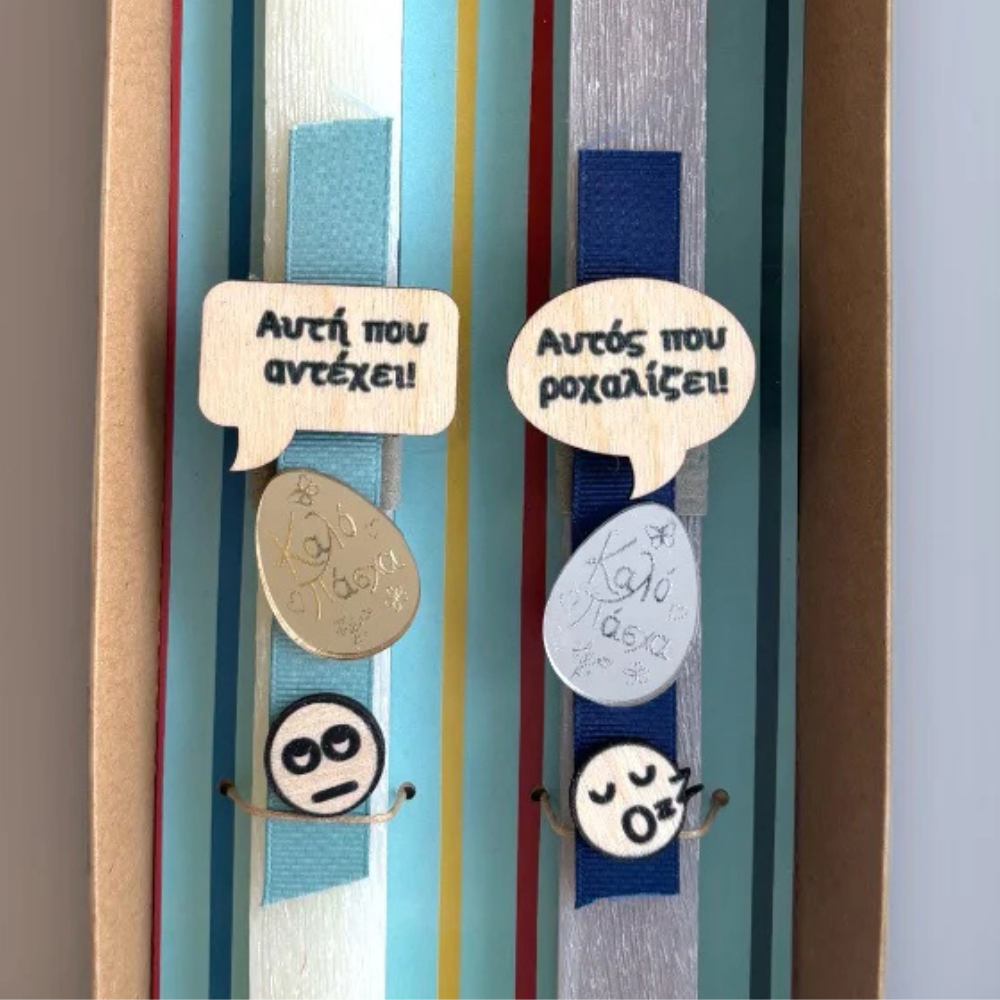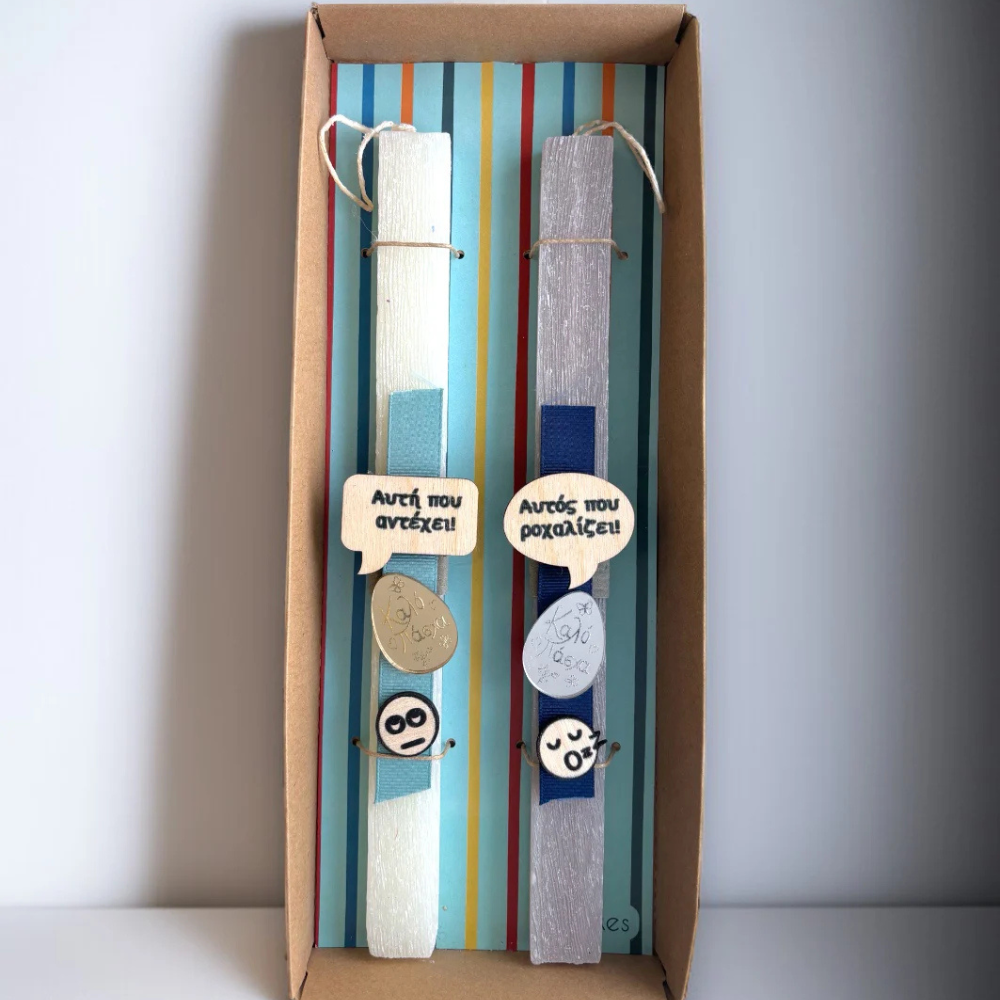- Η μία λαμπάδα είναι αφιερωμένη “Σε αυτή που αντέχει!”, ενώ η άλλη στον “Αυτόν που ροχαλίζει!”, συνοδευόμενες από αστεία ξύλινα μαγνητάκια που θα μείνουν ως διακοσμητικά μετά το Πάσχα.